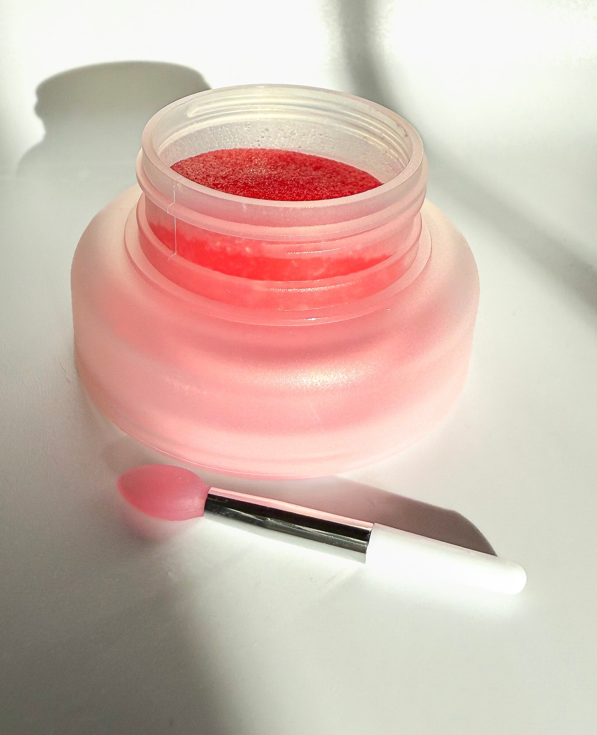Our lip scrub in the scent and flavor of strawberry makes your lips soft and
